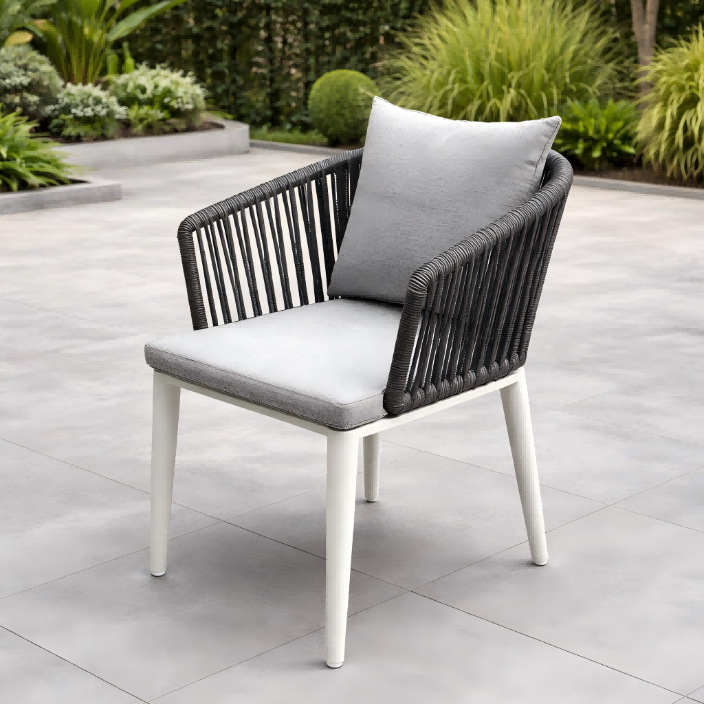 ダイニングチェアはロープ編みの背もたれが特徴で、快適なサポートを提供しながらモダンでエレガントな外観を作り出しています。フレームは粉体塗装されたアルミニウム製で、錆びや屋外の気象条件に対する優れた耐性を備えています。