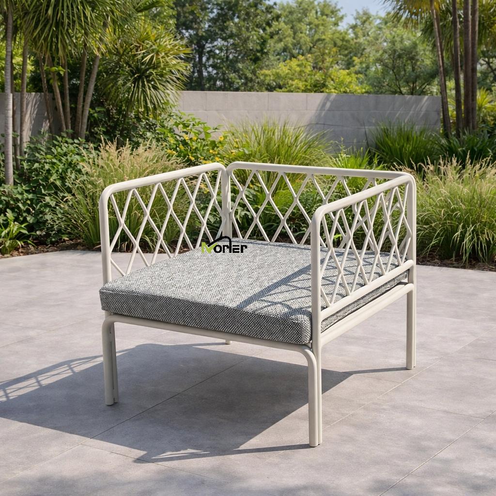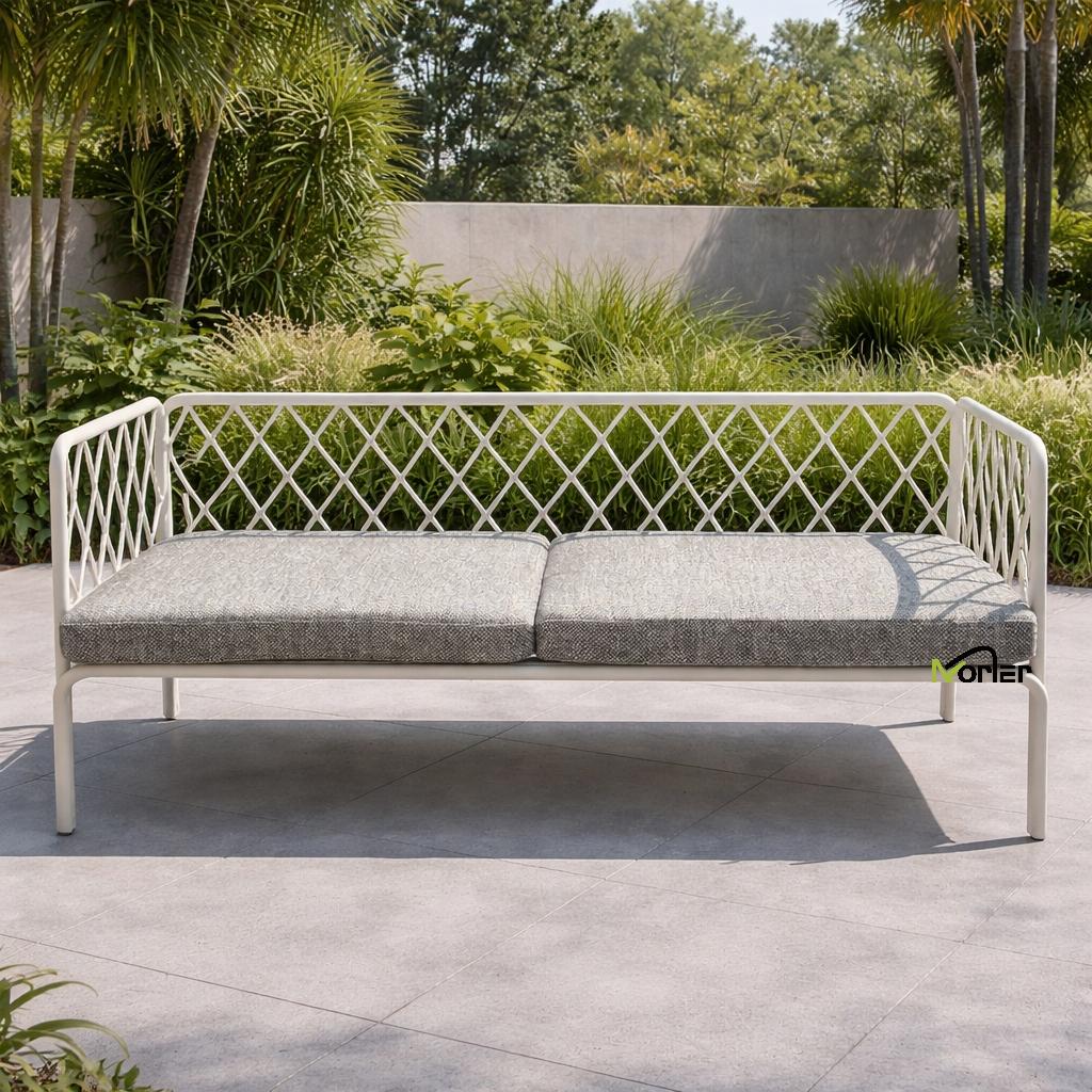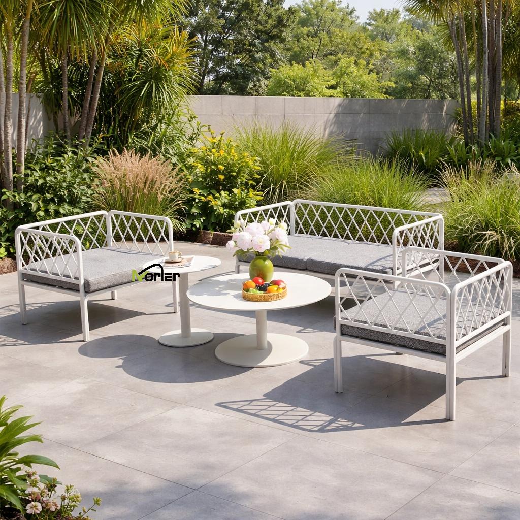 このモダンな屋外用ソファセットは、美しく細工された幾何学的な金属フレームを備えたクリーンでミニマルなデザインが特徴です。オープン格子構造は、強力な構造サポートを維持しながら、軽くてエレガントな外観を作り出します。